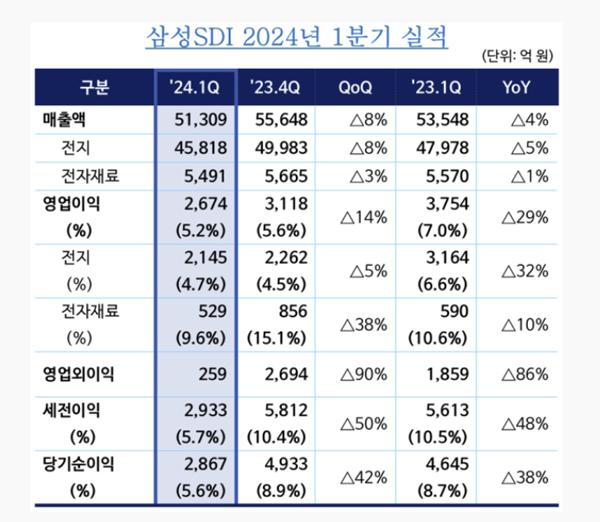 (Seoul=NSP NEWS AGENCY) = サムスンSDIが2024年第1四半期実績を発表した。売上は5兆1309億ウォン、営業利益は2674億ウォンとなった。