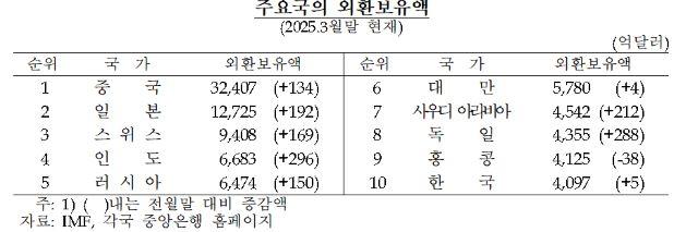 一方、韓国の3月の外貨準備高の規模は世界10位水準であることが分かった。前月の9位から1ランク下がった。2000年12月、韓国銀行が外貨準備高の世界順位を公開し始めて以来、最も低い順位だ。