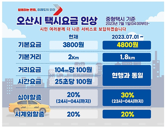 (경기=NSP통신) 조현철 기자 = 경기 오산시(시장 이권재)가 다음달 1일 오전 4시부터 택시요금이 인상됨에 따라 택시서비스 질적 향상에 나선다.