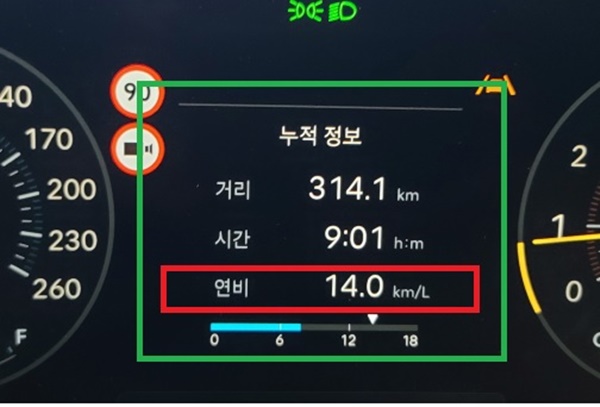 총 314.1km를 9시간 1분 동안 시승한 후 체크 한 현대차 쏘나타 디 엣지 가솔린 1.6 터보 모델의 실제 복합연비는 놀랍게도 14.0km/ℓ를 기록했다.