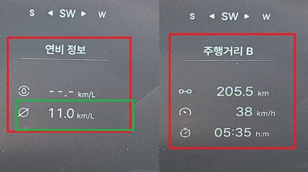 총 205.5km를 38km/h의 평균 속도로 5시간 35분 동안 시승한 후 체크 한 KG모빌리티 액티언 모델의 실제 주행 연비는 11.0km/ℓ를 기록했다.