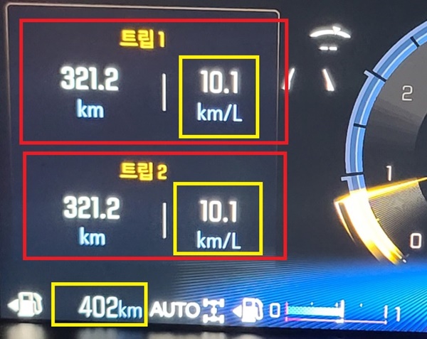 NSP통신-총 321.1km를 시승한 후 체크 한 쉐보레 올 뉴 콜로라도의 실제 주행 연비 10.1km/ℓ 기록과 총 321.1km를 시승한 후 남은 연료로 주행 가능 거리 402km 표시 (사진 = NSP통신)