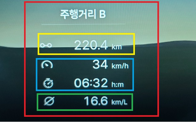 NSP통신-총 220.4km를 6시간 32분 동안 34km/h의 평균 속도로 시승한 후 체크 한 KGM 액티언 하이브리드 모델의 실제 연비 16.6km/ℓ 기록 (사진 = NSP통신)
