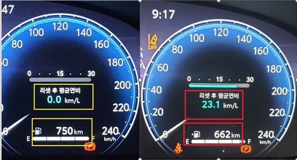 총 88km를 시승한 후 체크 한 토요타 캠리 하이브리드 모델의 실제 연비는 놀랍게도 무려 23.1km/L를 기록하며 공인 복합연비 17.1km/L보다 무려 6km/L 더 높은 연비를 기록했다.