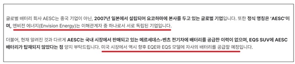 이어 “현재 알려진 것과 다르게 AESC는 국내 시장에서 판매되고 있는 메르세데스-벤츠 전기차에 배터리를 공급한 이력이 없으며 EQS SUV에 AESC 배터리가 탑재되지 않았다”며 “ 미국 시장에서 역시 향후 EQE와 EQS 모델에 자사의 배터리를 공급할 예정이다”고 덧붙였다.