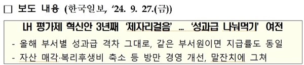한국일보는 27일 ‘LH 평가제 혁신안 3년째 제자리 걸음...성과급 나눠 먹기 여전’ 제하의 기사에서 “올해 부서별 성과급 격차 그대로, 같은 부서원이면 지급률도 동일…(중략)자산 매각·복리후생비 축소 등 방만 경영 개선, 말 잔치에 그쳐”라고 보도했다.