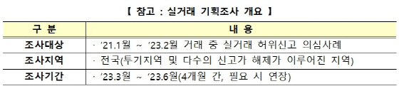 이번 기획조사는 지난 2021년부터 2023년 2월까지 다수의 신고가 해제 거래, 투기지역 고가주택 거래 중 신고가 해제 거래 등 실거래가 띄우기가 의심되는 1086건에 대해 실시할 예정이다.