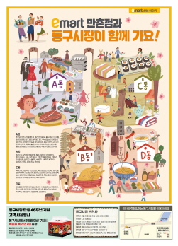 이마트 만촌점에서는 전단을 활용해 동구시장의 다양한 맛집 위치를 안내하고, 주요 점포를 소개할 예정이다.
