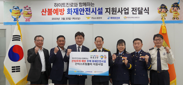 하이트진로는 지난 23일 전라남도 장흥군에 위치한 전남소방본부에서 산불방지예방 캠페인을 위한 물품 지원 전달식을 가졌다.