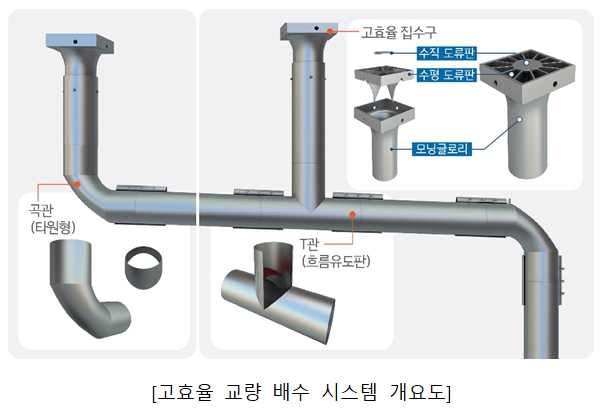 이를 방지하기 위해 집수구 상면에 수평도류판과 수직도류판이 결합된 나팔관 형상의 유입부를 적용함으로써 와류를 저감시켜 신속한 우수의 흐름이 가능하도록 했다. 또 퇴적물에 의한 물의 흐름을 방지하기 위해 수직방향의 흐름을 수평방향으로 변경하는 흐름유도판이 부착된 T관을 활용하고 빠르게 물을 흐를 수 있도록 설계됐다.