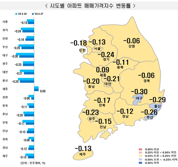 시도별로는 세종(0.09%)은 상승, 대구(-0.30%), 울산(-0.29%), 부산(-0.26%), 경기(-0.24%), 광주(-0.23%), 대전(-0.21%), 충남(-0.20%), 인천(-0.18%), 전북(-0.17%) 등이 하락했다.