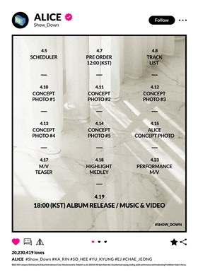 앨리스는 5일 공식 SNS를 통해 오는 19일 오후 6시 싱글 앨범 ‘쇼 다운’(SHOW DOWN) 발매까지의 관련된 다양한 컨텐츠 공개 일정을 담은 컴백 스케줄 포스터를 공개했다.