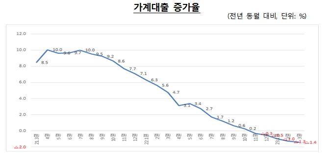 금융당국은 “전금융권 가계대출이 지난해 9월 이후 감소세가 지속되는 가운데 가계부채가 안정적으로 관리되도록 모니터링을 지속하는 한편 고금리에 따른 가계부채 위험요인이 없는지 지속 점검해나가겠다”고 밝혔다.