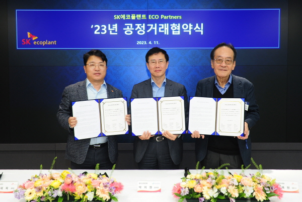 NSP통신-임재욱 SK에코플랜트 경영지원센터장(왼쪽), 박치형 동반성장위원회 운영처장(왼쪽 두 번째), 최재원 외주 에코파트너스 회장(왼쪽 세 번째)이 공정거래 협약서를 들고 기념촬영을 하고 있다. (사진 = SK에코플랜트)