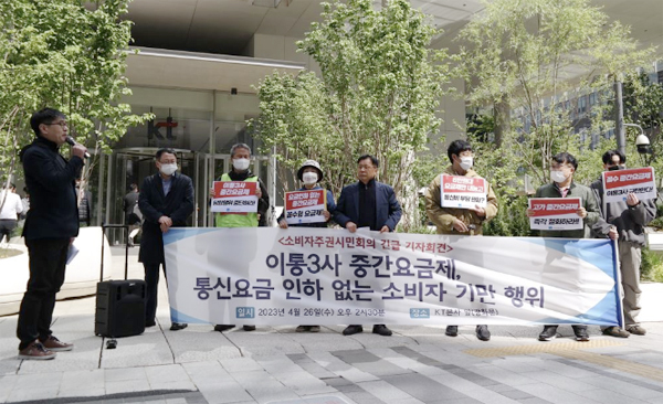 (서울=NSP통신) 이복현 기자 = 소비자주권시민회의가 최근 발표한 이통3사의 5G 중간요금제를 규탄하는 기자간담회를 지난 26일 광화문 KT본사 앞에서 개최했다.