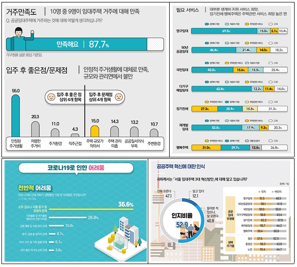 이번 데이터 공개는 서울시민이 공공임대주택의 전반적인 특성을 보다 쉽게 이해할 수 있도록 지원하기 위해 마랸됐다. 이에 단순한 데이터 공개를 넘어 응답결과에 대한 인포그래픽 등을 제공해 조사결과에 대해 시민이 한 눈에 쉽게 이해할 수 있도록 구성했다.