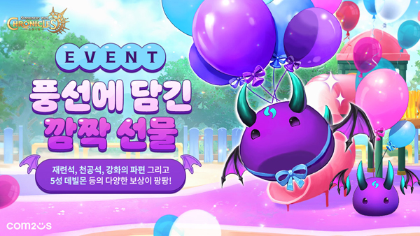 (서울=NSP통신) 이복현 기자 = 컴투스(대표 이주환)가 소환형 RPG 크로니클에서 핵심 성장 아이템인 ‘데빌몬’을 얻을 수 있는 ‘풍선에 담긴 깜짝 선물’ 이벤트를 진행한다.