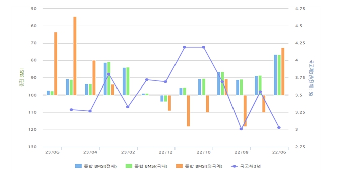 23일 금융투자협회는 ‘2023년 6월 채권시장지표(BMSI)’를 발표했다. 조사기간은 지난 12일부터 17일까지이며 채권보유 및 운용관련 종사자(191개 기관, 830명)를 대상으로 설문한 결과 53개 기관 100명이 응답했다.