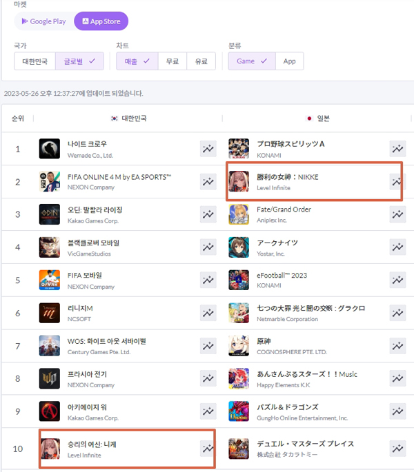 시프트업이 개발하고 레벨 인피니트가 서비스하는 승리의 여신:니케가 지난 18일 진행한 업데이트로 일본 매출 최상단을 기록하고 국내에서도 매출 톱10 진입에 성공했다.