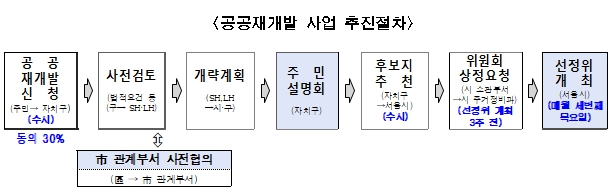 이에 따라 앞으로 공공재개발은 사업을 원하는 지역 주민이 30% 이상 동의를 얻어 자치구로 수시신청한다. 이에 자치구 사전검토․개략계획(LH·SH공사)에 대한 주민설명회를 거쳐 후보지를 추천하고 시는 추천받은 곳을 대상으로 매월 세 번째 목요일 선정위원회를 열고 후보지를 선정하게 된다.