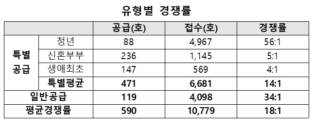 특별공급은 총 471가구 공급에 6681명이 신청해 14대1을 기록했다. 유형별로는 청년특별공급(56대1)이 최고 경쟁률을 기록했으며 신혼부부특별공급(5대1), 생애최초특별공급(4대1) 순으로 높았다.