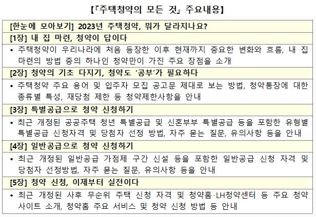 이번 개정판은 총 5개의 장으로 구성되며 세부적으로는 민영주택 가점제 구간, 공공주택 청년 특별공급, 사후 무순위 주택 신청자격 등을 중심으로 개정됐다.