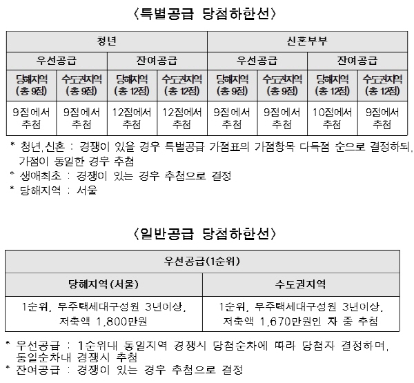 특별공급의 경우 청년 유형은 ▲우선공급(만점 9점) 9점 ▲잔여공급(만점 12점) 12점 등 가점 만점자 추첨으로 당첨자를 선정했다. 신혼부부 유형은 ▲우선공급(만점 9점) 9점 ▲잔여공급(만점 12점) 당해지역 10점, 수도권 9점에서 추첨으로 진행했다. 생애최초 유형은 전원 추첨으로 당첨자를 선정했다.