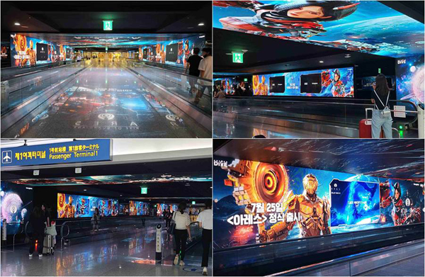 아레스는 인천공항 제1 여객터미널 AMT(아트 미디어 터널)을 가득 채웠다. 해당 위치는 인천국제공항과 교통센터를 연결하는 초대형 DOOH(디지털 옥외광고)로 수많은 국내외 여행객들이 왕래하는 핵심 장소다.
