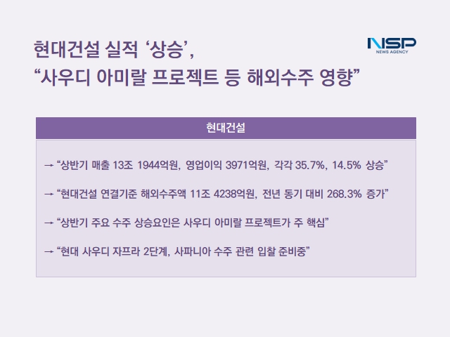 (서울=NSP통신) 정의윤 기자 = 현대건설의 상반기 영업이익이 3971억원으로 14.5% 증가하며 ‘상승세’를 탔다. 이같은 결과는 사우디 아미랄 프로젝트 수주 핵심을 바탕으로 수주 연간 수주 목표 금액 70%를 넘기며 실적 ‘상승’이 이어진 것.