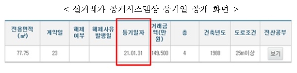 이에 따라 2023년 1월 이후 거래 계약된 전국 소재 공동주택(아파트)에 대해 대법원 등기정보와 연계해 소유권 변경을 위한 ‘등기일’을 시범 공개한다. 향후 운영성과 점검 및 필요 시 시스템 보완을 거쳐 오는 2024년 상반기부터 연립·다세대 등으로 공개 범위를 확대해 나갈 계획이다.