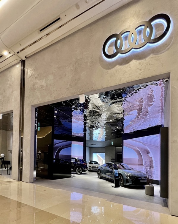 아우디 전시장 입구 정면에 설치된 2개의 대형 미디어월은 ‘빛’을 컨셉으로 미디어 아티스트 그룹인 ‘이스트 허그’와 함께 제작해 미디어아트가 전시 차량과 어우러지는 것에 중점을 두어 표현됐다.