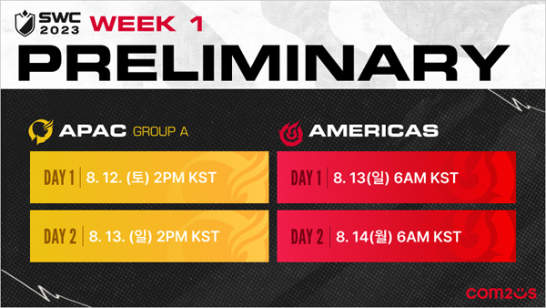 이외 관전의 재미를 더하는 승부 예측 이벤트 등이 마련된다. 이번 아시아퍼시픽컵 A조 예선과 아메리카 지역 예선의 승부 예측 이벤트는 각각 경기가 시작되는 12일 오후 1시 반, 13일 오전 5시 반까지 진행되며 참여 시 SWC2023 휘장 등 여러 가지 보상을 획득할 수 있다.