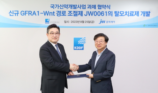 JW중외제약은 Wnt 표적 탈모치료제 ‘JW0061’이 ‘2023년도 1차 국가신약개발사업’ 지원 과제로 선정돼 국가신약개발사업단과 연구개발 협약을 체결했다고 28일 밝혔다. 이번 협약으로 JW중외제약은 국가신약개발사업단으로부터 향후 2년간 JW0061의 비임상 연구비를 지원받는다.