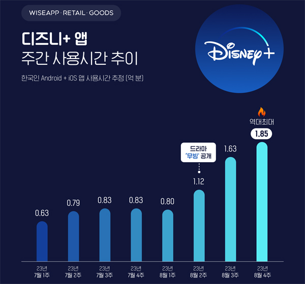 디즈니플러스 앱의 주간 사용시간은 8월 2째주 1.12억 분, 8월 3째주 1.63억 분, 8월 4째주 1.85억 분으로 ‘무빙’ 공개 이후 매주 증가하고 있다.
