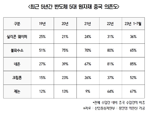(서울=NSP통신) 이복현 기자 = 국회 산업통상자원중소벤처기업위원회 소속 정일영 국회의원(더불어민주당, 인천 연수을)이 산업통상자원부로부터 받은 지난 5년간 반도체 주요원자재 수입 현황을 분석환 결과, 2019년부터 2023년 7월까지 반도체 주요 원재료 5개 품목(실리콘웨이퍼, 불화수소, 네온, 크립톤, 제논)의 중국 의존도가 대폭 상승한 것으로 확인됐다.