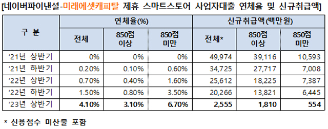 19일 금융감독원이 국회 정무위원회 소속 송석준 의원 (국민의힘, 경기 이천시)에게 제출한 자료에 따르면 네이버파이낸셜-미래에셋캐피탈 스마트스토어 사업자대출 연체율이 2022년 하반기 1.5%에서 2023년 상반기 4.1%로 급등했다. 신규취급액은 203억원에서 26억원으로 급감했다.