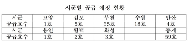 이번에 공급하는 주택은 총 59가구로 경기도 내 8개 시(고양, 김포, 부천, 수원, 안산, 용인, 평택, 화성)에 위치 하고 있다.