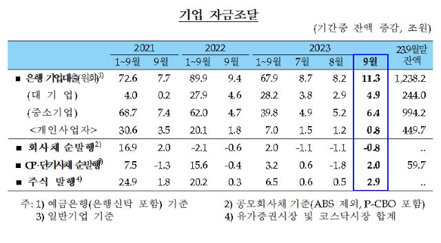 반면 은행 기업대출은 크게 확대됐다. 기업대출 증가규모는 지난 8월 8조 2000억원에서 9월 11조 3000억원으로 늘었다.