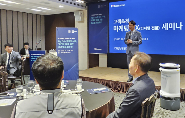 세미나는 KT 강남법인고객본부장 성원제 상무의 인사말로 시작해 마케팅 디지털 전환 성공 사례 발표, KT 타겟 마케팅 서비스 ‘K-Ads’ 소개와 시연으로 이어졌다. K-Ads는 KT 빅데이터에 기반해 고객의 관심사와 라이프스타일에 맞는 마케팅 문자를 발송하는 서비스다.