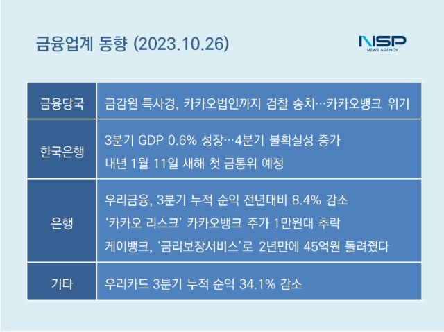 (서울=NSP통신) 강수인 기자 = 내리막길을 걷고 있던 카카오뱅크 주가가 결국 1만원대로 떨어졌다. 카카오 법인의 법정리스크로 대주주 적격성에 문제가 발생했기 때문이다. 한편 고금리 여파로 조달비용 부담이 늘면서 카드사 실적에도 빨간불이 켜졌다.