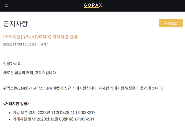 고팍스는 공지를 통해 “위믹스가 신규 거래지원된다”며 “안정적인 거래를 위해 8일 17:00부터 5분간은 매도 주문 등록만 가능하며 17:05부터 정상적인 거래가 가능하다”라고 밝혔다.
