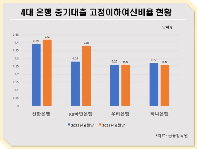 이중 올 6월말 기준 4대 시중은행의 중소기업 고정이하여신 비율은 ▲신한은행 0.42% ▲KB국민은행 0.38% ▲우리은행 0.26% ▲하나은행 0.26%로 나타났다. 특히 KB국민은행의 경우 지난해 6월말 보다 중소기업 고정이하여신비율이 0.10%p 확대됐다.