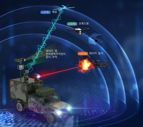 한화시스템은 중요 지역에 침투하는 불법 드론·소형 무인기 위협에 대응하기 위해 중요 시설에 설치하는 시설형과 거리별로 세분화해 소프트킬(Soft Kill·재밍)과 하드킬(Hard Kill·그물포획 및 레이저)로 타격할 수 있는 이동형 다계층 복합방호 대드론(Anti-drone) 시스템을 구축한다.