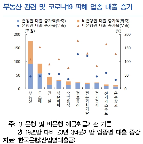 산업별로는 부동산 관련 업종과 코로나19 피해 서비스업을 중심으로 대출이 크게 증가했다. 코로나19 이후 부동산업(+175조 7000억원)과 건설업(+44조 3000원) 대출이 비은행권을 중심으로 큰 폭 증가해 분석대상 업종 전체 대출 증가 규모(+567조 4000억원)의 38.8%를 차지하였다.