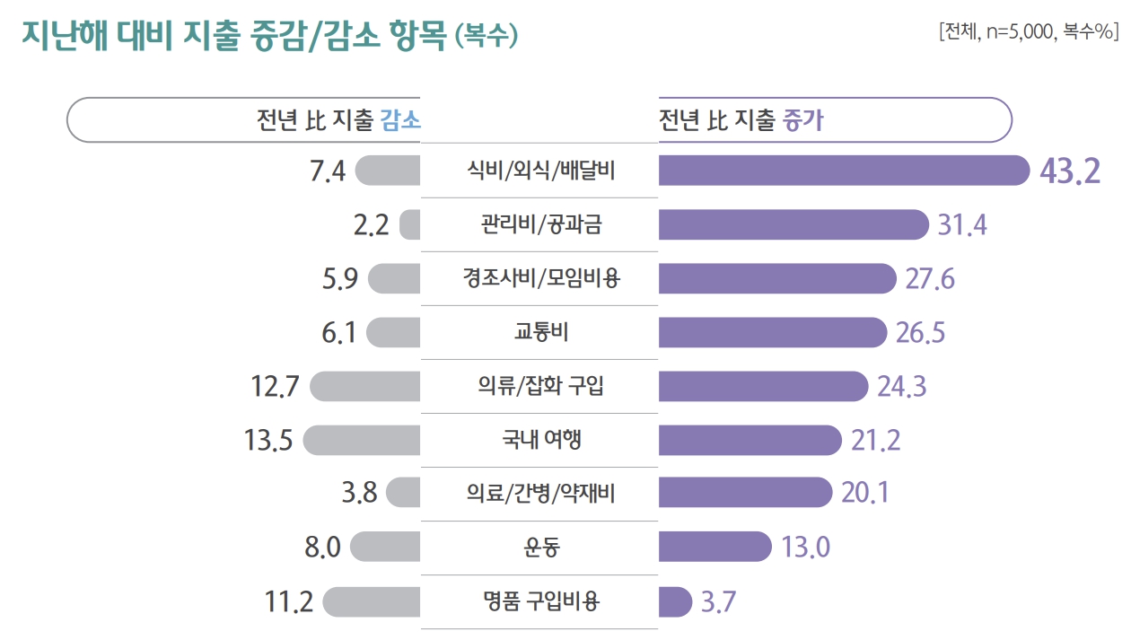 반면 의류·잡화 구입, 국내 여행, 명품 구입 비용 등은 상대적으로 감소했다는 응답이 높았다.