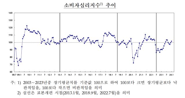 24일 한국은행이 발표한 ‘2024년 1월 소비자동향조사 결과’에 따르면 월중 소비자심리지수(CCSI)는 101.6으로 전월 대비 1.9p 상승했다. CCSI는 소비자동향지수(CSI)중 6개 주요지수를 이용해 산출한 심리지표로서 100보다 높으면 낙관적, 100보다 낮으면 비관적임을 의미한다.