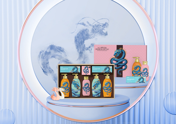 AI 청룡에디션 선물세트는 디자인뿐만 아니라 세트에 들어가는 제품에도 정성을 담았다. 오가니스트, 온더바디, 페리오 등 LG생활건강 대표 브랜드의 샴푸, 컨디셔너, 바디워시, 비누, 치약을 담아 선물세트를 주고받는 이들 모두 만족감을 느낄 수 있도록 구성했다.