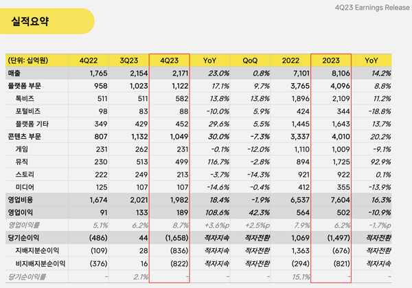 사업 부문별로 살펴보면 카카오의 2023년 4분기 플랫폼 부문 매출은 전 분기 대비 10%, 전년 동기 대비 17% 증가한 1조1217억 원으로 집계됐다.