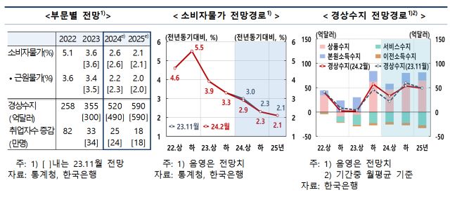 한은은 올해 경상수지는 520억달러로 당초 전망인 490억달러를 상회할 것이라고 예상했다. 한은은 “상품수지는 반도체 경기회복 지속, 미국의 양호한 성장, 국내수요 둔화 등으로 흑자폭이 당초 예상보다 확대될 전망”이라고 밝혔다. 반면 “서비스수지는 예상보다 저조한 외국인 관광객 입국 등으로 적자폭이 확대될 전망”이라고 내다봤다.