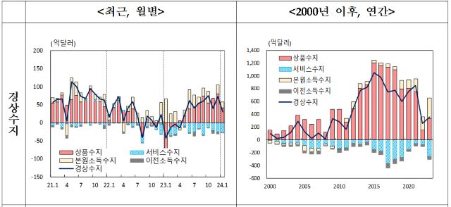 서비스수지는 출국자 수 증가 등으로 여행, 가공서비스 등을 중심으로 26억 6000만달러(3조 5215억 7400만원) 적자를 기록했다. 본원소득수지는 배당소득을 중심으로 16억 2000만달러(2조 1447억 1800만원) 흑자를 나타냈다. 이전소득수지는 1억 5000만달러(1985억 5500만원) 적자를 기록했다.